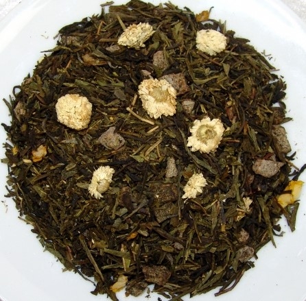 Zutaten: Teemischung (grüner Tee, weißer Tee) (80%), Pfirsichstücke mit Trennmittel Reismehl, Aroma, Teeblüten, Wollblumenblüten.