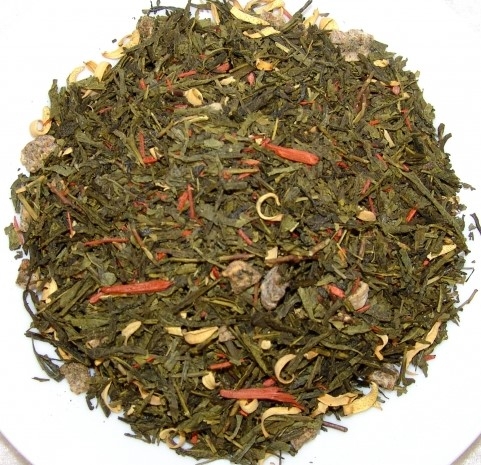 Zutaten: Grüner Sencha, Feigenstücke (Feigen, Reismehl), Aloe-Vera-Stücke (Zucker, Aloe-Vera, Zitronensäure, Natriumdisulfit (SO2)), Sandelholz, Aroma, Kombuchapulver, Orangenblüten.