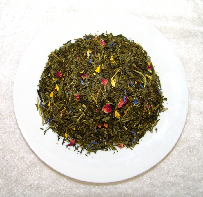 Zutaten: Grüner Tee, Aroma, Sonnenblumenblüten, Rosenblütenblätter, Kornblumenblütenblätter.