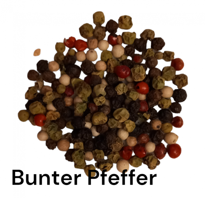 Unsere bunte Pfeffermischung schmeckt aromatisch-würzig und besitzt eine mittlere Schärfe mit leicht fruchtiger Note. Die Mischung besteht aus ausgesuchten Qualitäten weißer, schwarzer und grüner Pfeffersorten aus besten Anbaugebieten. Ein fruchtig-süßes Aroma und die schöne Optik verleihen die Rosa Beeren oder Schinusbeeren aus den Brasilianischen Regenwäldern.