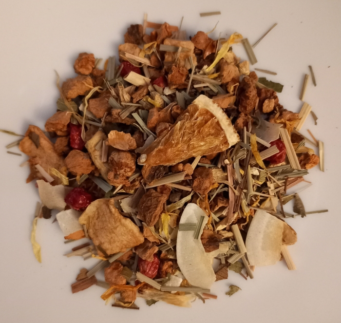 Zutaten: Apfelstücke, Kokos-Chips, Lemongras, Ingwer, Apfelecken, Zimt, Zitronenmyrthe, Zitrusscheiben, Ringelblumenblütenblätter, Rote Johannisbeere