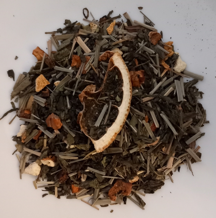 Zutaten: Grüner Tee (52%), Apfelstücke, Lemongras, Zitrusschalen, natürliches Aroma, Zitrusscheiben, Brennesselblätter, Guaranasaat, Hanfsaat (1%), Orangensaftstücke, Sonnenblumenblütenblätter