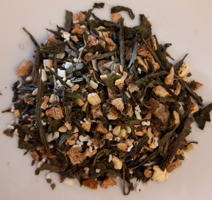 Zutaten: Grüner Tee (31%), Ingwer (24%), weiße Kakaobuttersplits (Zucker, Kakaobutter, Dextrose), Mandeln gehackt, Ingwerstücke (Ingwer, Zucker) (10%), Zitrusschulen, Aroma, Amaranth