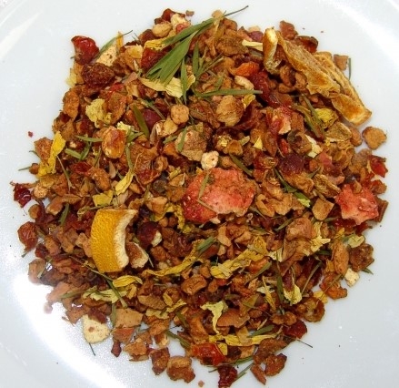 Zutaten: Apfelstücke, Hagebuttenschalen, Zitrusscheiben, Zitrusschalen, Sonnenblumenblütenblätter, Erdbeerscheiben (2,5%), Lemongras, Erdbeerstücke (2%), Säuerungsmittel Zitronensäure, natürliches Aroma