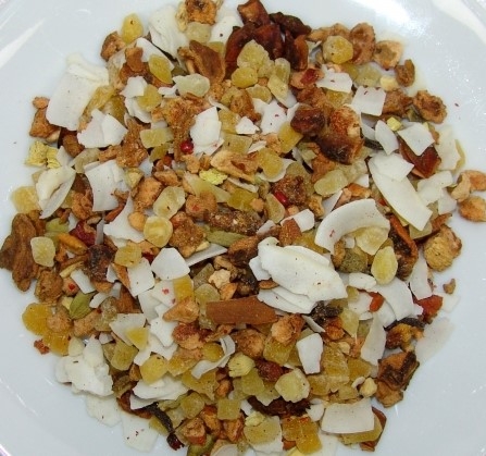 Zutaten: Mangostücke (Mango, Zucker, Säurungsmittel: Zitronensäure) (55%), Apfelstücke, Kokos-Chips, Sternanis, Zimt, Kardamomfrüchte, Ingwer, Süßholzwurzel, Gewürznelken, Rosa Pfeffer, Aroma.