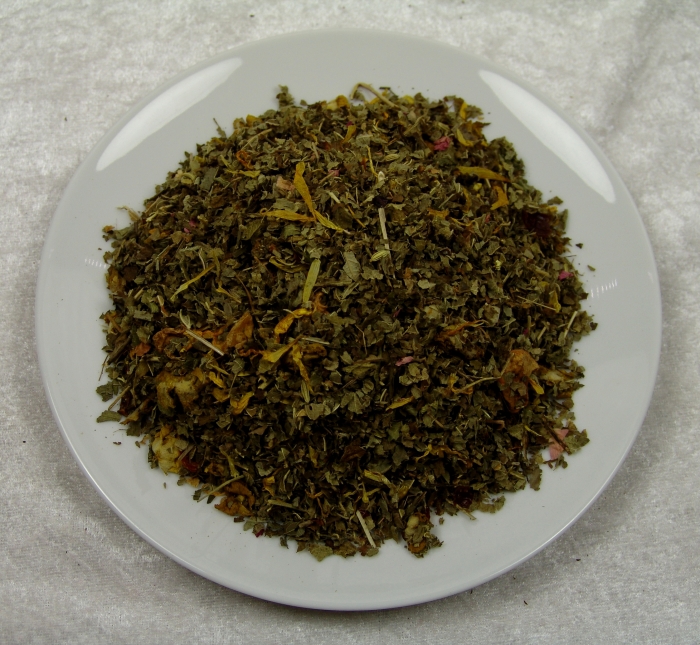 Zutaten: Brombeerblätter, Fenchel, Wollblumenblüten, Melisse, Anissamen, Spitzwegerichblätter, Hagebuttenschalen, Apfelstücke, Ringelblumenblütenblätter, Aroma, Holunderblüten, Holunderbeeren, Pfingsrosenblütenblätter, Pfefferminze.