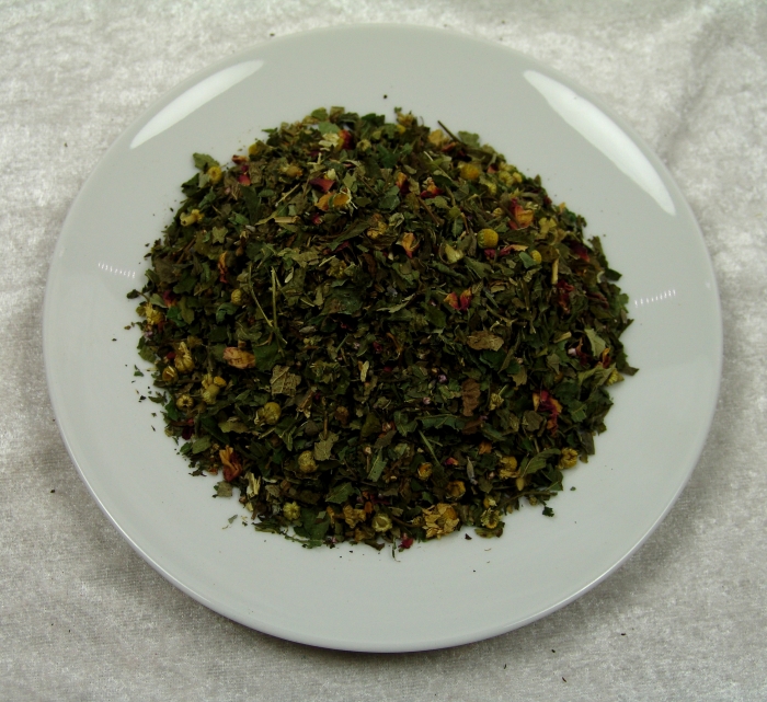 Zutaten: Brombeerblätter, Pfefferminze, Melisse, Kamille, Rosenblütenblätter, Heideblüten, Lavendelblüten